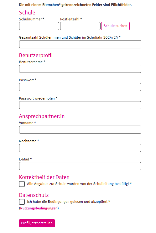 4. Lassen Sie sich vor Abschluss der Registrierung von der Schulleitung die eingetragenen Daten bestätigen. Das ist vor allem bei der anzugebenden Gesamtzahl aller Schülerinnen und Schüler der Schule im laufenden Schuljahr wichtig.